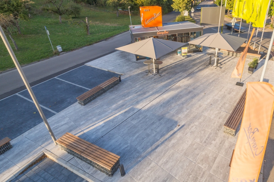 Im Einkaufscenter Kö8 in Köngen am Neckar versorgt der neue Imbiss „CurryBox“ ab sofort die Shopper mit Currywurst, Burger und Co. Da Kleckern zum Fast-Food-Geschäft gehört, ist die Standfläche strapazierfähig und reinigungsfreundlich ausgelegt, wobei die gestalterische Qualität nicht zu kurz kommt. Gewählt wurden muschelkalkfarbene Großformate mit reinigungsfreundlicher proClean Oberfläche. Die Tiefenhydrophobierung des Betons verhindert weitgehend das Eindringen von Schmutzwasser, die Oberflächen lassen sich leichter säubern. Zudem bleibt das attraktive Erscheinungsbild der Sichtflächen vollständig erhalten.