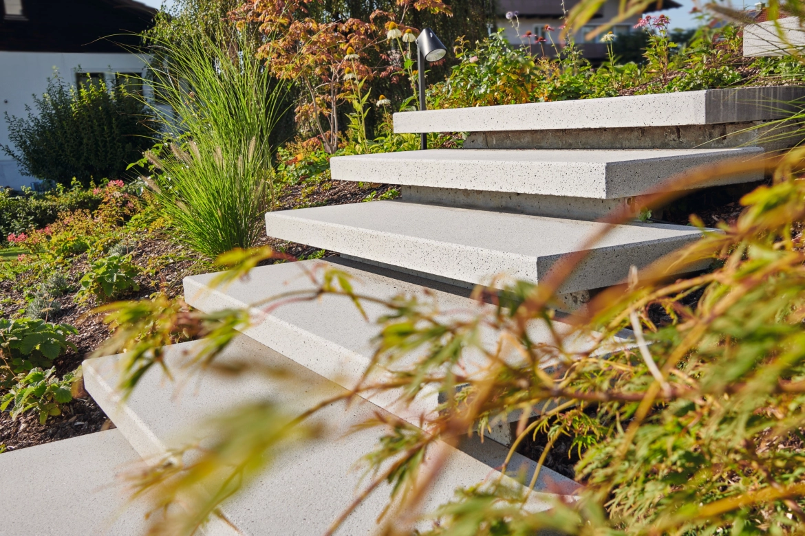 Die richtige Beleuchtung macht Schwebestufen nicht nur sicherer, sondern unterstreicht auch ihre besondere architektonische Wirkung. Dezent integrierte LED-Leisten oder punktuelle Einbaustrahler lassen die Stufen im Dunkeln scheinbar schwerelos wirken und setzen elegante Lichtakzente. Besonders in den Abendstunden entsteht so ein stimmungsvolles Spiel aus Licht und Schatten – funktional und atmosphärisch zugleich. Ob als Wegbeleuchtung oder als gestalterisches Highlight: Die Kombination aus Licht und Schwebestufen verleiht dem Außenraum eine besondere Tiefe und moderne Eleganz.