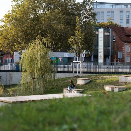 Aalen hat den früher versiegelten Rathausplatz in eine naturnahe, klimafreundliche Fläche mit Grünbereichen und offenem Stadtbach umgestaltet. Auf den Wegen unterstützt der GDM.KLIMASTEIN die natürliche Versickerung und Verdunstung von Regenwasser und verbessert so das Stadtklima.