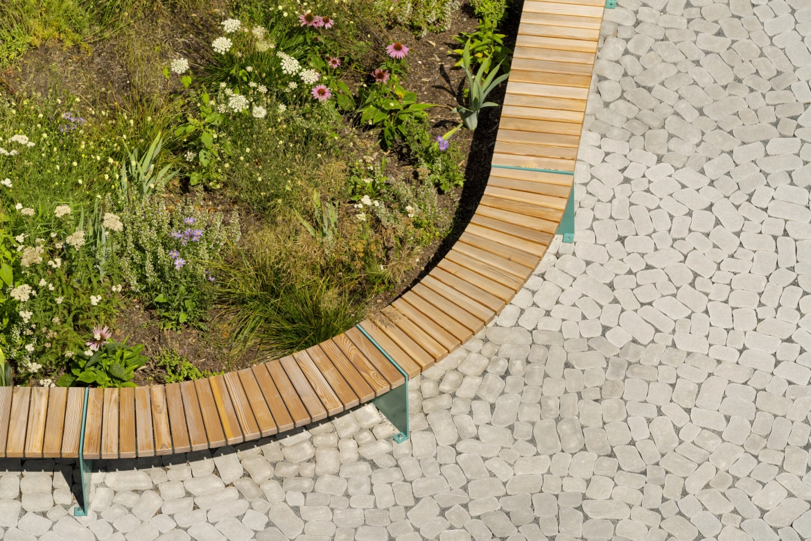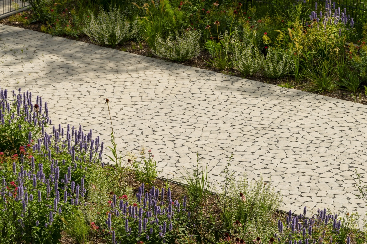 Die ausreichenden Abstände zwischen den Steinen ermöglichen eine effektive Versickerung von Regenwasser und fördert die Neubildung von Grundwasser. Die Zwischenräume können zudem begrünt werden. Das ist optisch ansprechend ist und bindet den Flächenbelag in ein natürliches Umfeld ein. Die Begrünung schafft einen naturnahen Lebensraum und trägt zur Verbesserung des Mikroklimas bei.