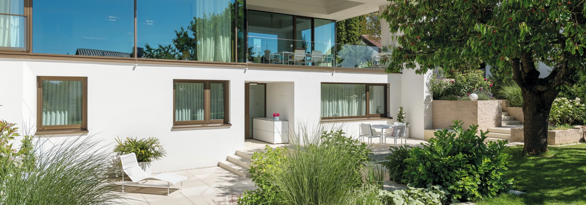 Der Garten und die Terrasse wurden entlang des Hauses angelegt und folgen dabei geschickt dem natürlichen Gelände. Dies ermöglicht eine nahtlose Integration in die umgebende Landschaft. Der Höhenunterschied zwischen der Terrasse, der Zufahrt und dem umgebenden Garten wird elegant mit abgetreppten Bereichen überwunden. Die Treppenanlage wurde mit farblich abgestimmten GDM.NUEVA step Stufen gestaltet. Mauern und Blumenbeete begleiten auf dem Weg und dienen, nicht nur als visueller Höhepunkt, sondern schaffen eine charmante Verbindung zwischen den verschiedenen Ebenen. Das Zusammenspiel von Architektur und Natur verleiht diesem Außenbereich eine einladende Atmosphäre, die zum Verweilen und Genießen einlädt.